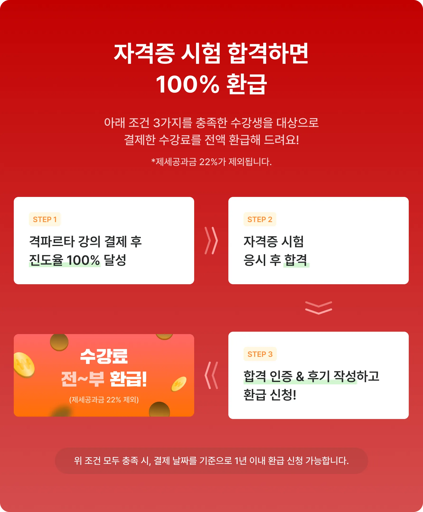 시즌2에서는 더욱 많은 분들이 자격증 합격 후 수강료를 환급 받아가실 수 있도록 환급 신청 기한이 5개월 → 1년으로 연장되었습니다. (*제세공과금 22% 제외)